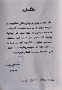 ئەو خانەوادانەی لە هەڵەبجە کوڕ و کچ، یان باوک و دایکیان شەهیدی شارەکەن و ناویان لەسەر کێلەکانی گۆڕستانی سمبولی نەنوسراوە، با بچن بۆ بەڕێوەبەرایەتی یادگاری هەڵەبجە.