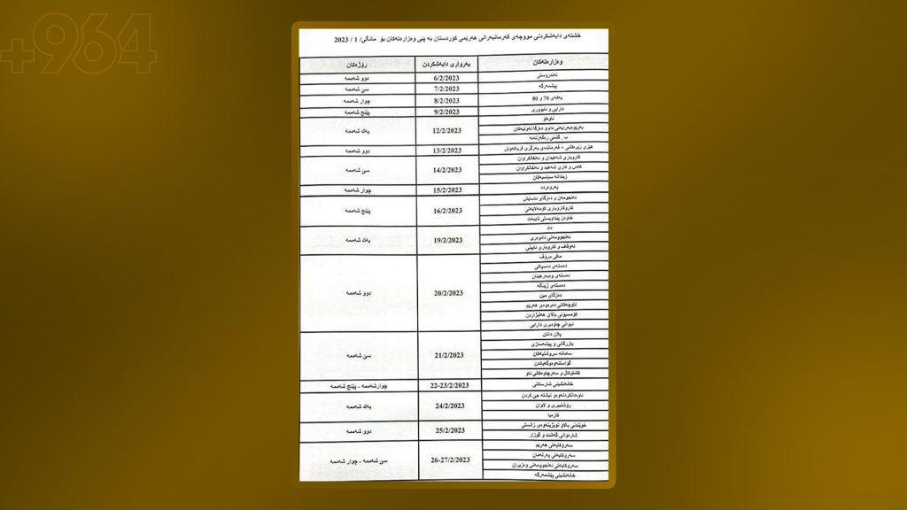 رۆژی 6ی شوباتی 2023 دەست بە دابەشکردنی مووچەی مانگی کانوونی دووەمی 2023 کرا و یهكهمین وهزارهتیش تهندروستى بوو وهریگرت، حکومەتیش لە راگەیێندراوێكیدا سهرهڕاى بڕیاردانى 3 رۆژ پشووى فهرمى له ههرێم، بهڵام وتى “پڕۆسەی دابەشکردنی مووچەی فەرمانبەران بەردەوام دەبێت.”
