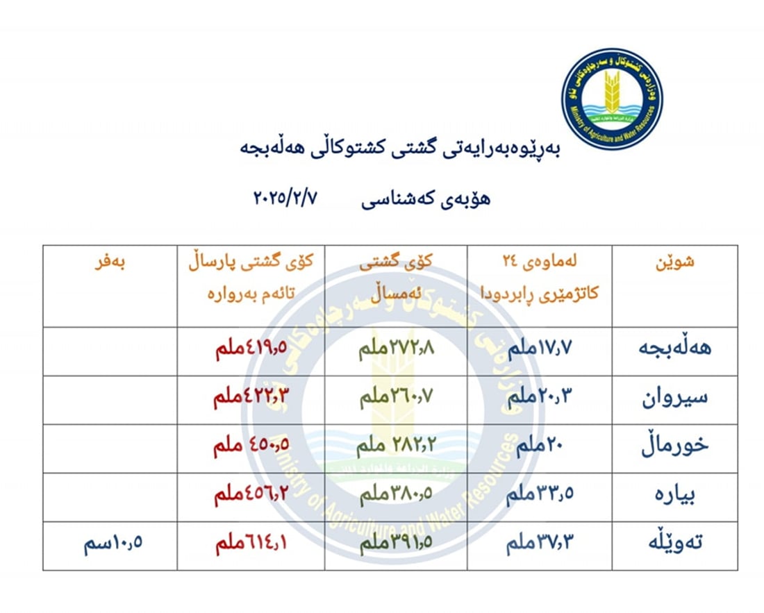 داتاکەی کشتوکاڵ تا رۆژی 7.2.2025ی تێدا تۆمار کراوە، لە ناوەندی هەڵەبجە، 272.8 ملیم، لە سیروان 260.7 ملیم، لە خورماڵ 282.2 ملیم، لە بیارە 380.5 ملیم و لە تەوێڵە 391.5 ملیمەتر باران باریوە.