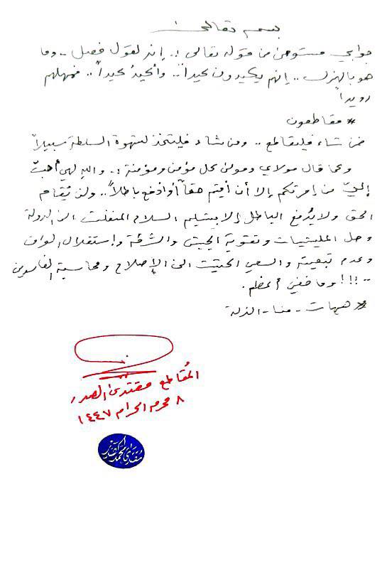 موقتەدا سەدر لە نووسراوێكدا دەڵێت، ” بڕیارەكەم جدیە و بڕیارێكی لاواز نییە… ئێمە بایكۆتمان كردووە… ئەوەی ئارەزوو دەكات با بایكۆت بكات… ئەوەشی پێی خۆشە با بەرەو ئارەزووی دەسەڵات بڕوات”.